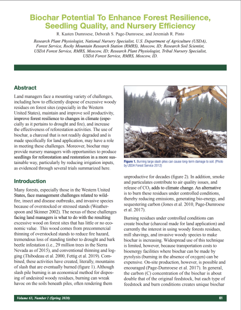This 7-page fact sheet from the US Forest Service describes several methods for making and using biochar in forest soils and tree nurseries. Land managers face a mounting variety of challenges, including how to efficiently dispose of excessive woody residues on forest sites (especially in the Western United States), maintain and improve soil productivity, improve forest resilience to changes in climate (especially as it pertains to drought and fire), and increase the effectiveness of reforestation activities. The use of biochar, a charcoal that is not readily degraded and is made specifically for land application, may have a role in meeting these challenges. Moreover, biochar may provide nursery managers with opportunities to produce seedlings for reforestation and restoration in a more sustainable way, particularly by reducing irrigation inputs, as evidenced through several trials summarized here.